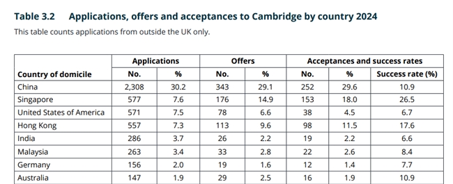 国际学生申请部分专业时,雅思成绩需达到总分7.5 分且单项不低于7分。从剑桥大学发布的《Overseas Admissions By Domicile》数据来看,2024 年中国大陆地区共有2308人递交申请,仅343人收获 offer,offer发放率为 14.9%,竞争激烈程度可见一斑。